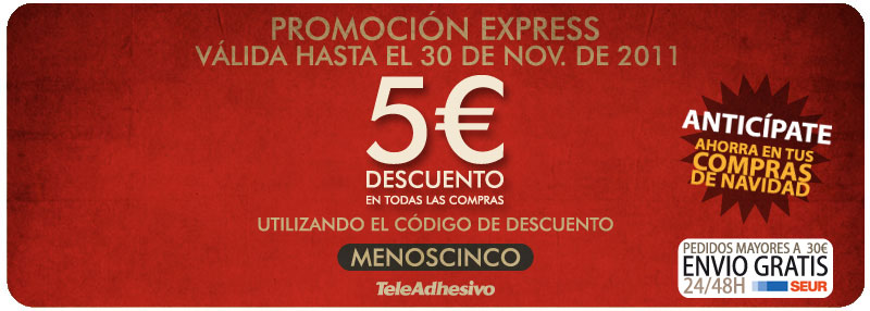 Ya se acaba Noviembre y mañana finaliza nuestra promoción “MenosCinco” ¿Conoces nuestros descuentos? Entra en el enlace y échales un vistazo, seguro que no te decepcionan. Descuentos en Teleadhesivo
