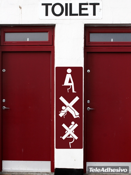Además de indicar en cada puerta de cada aseo el sexo, ellos o ellas, podemos incluir este graciosísimo vinilo en el que indicamos, por no decir suplicamos a nuestros clientes que no realicen según que acciones.