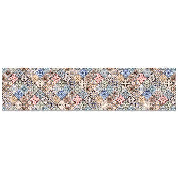 Cenefa adhesiva de vinilo azulejos tradicionales. Composición de baldosas dando un resultado de azulejos de estilo clásico en distintos tonos azules y morados ideales para dar colorido a una cocina. Esta cenefa se compone de imágenes de alta resolución, esto hace que puedan fabricarse en gran formato sin que pierdan calidad. Es un diseño exclusivo para renovar tus paredes y espacios. El diseño del patrón permite unir unidades una tras otra sin fin. Su instalación es fácil y sencilla.